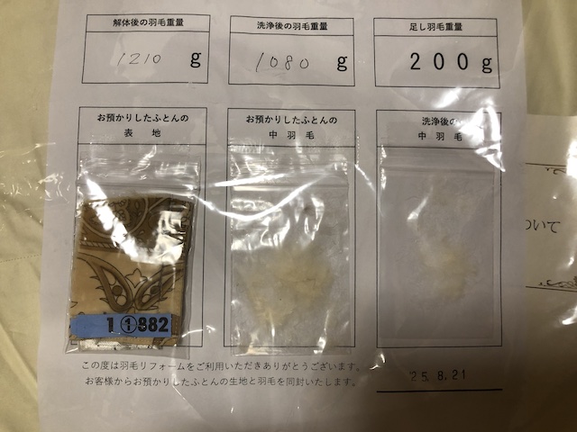ふとん袋に布団を入れて返送するとリフォームされ、1〜2ヶ月半後に返送されるそうです。同梱されていた書類に、