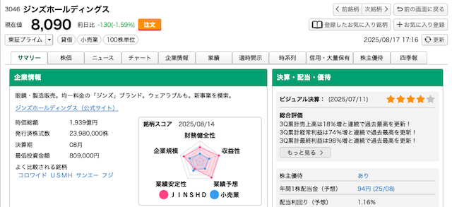 25.8現在、ジンズホールディングスの株価は1株8,000円を超えたあたりで高止まりしています。