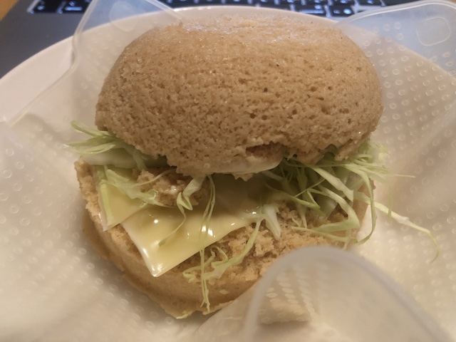 横からスプーンで切って、キャベツとチーズをはさんでみました↓。卵も入れればよかった。