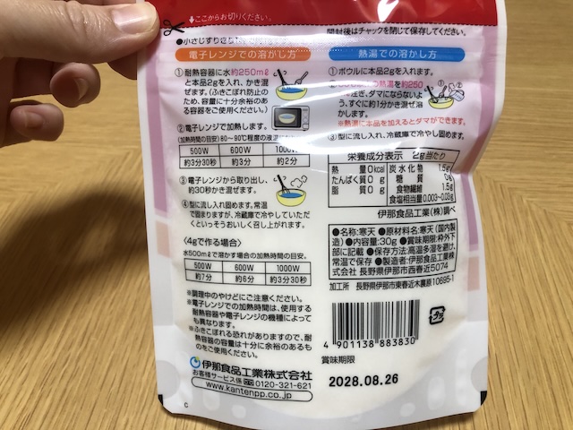 夏場、お湯にこの寒天を溶いて、冷やして黒蜜やゆであずきなどで食べていました。