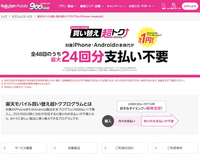 楽天モバイルでiPhone16eに買い替えた場合「25回目に返却すると残りの支払いは無料」と書かれています。