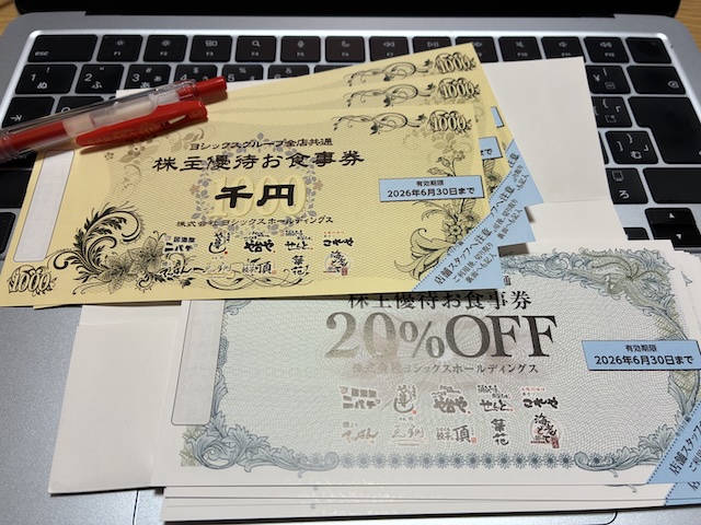 | ヨシックスホールディングス | 優待食事券(年間6,000円相当)、株主優待割引券(20%割引券) |