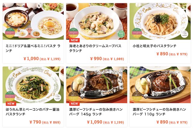 | ココス | 700円前後〜 | パスタ、肉料理など |