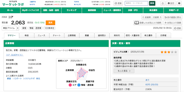 2025年9月16日現在、コアの株価は1株2000円を少し超えたところで推移しています。